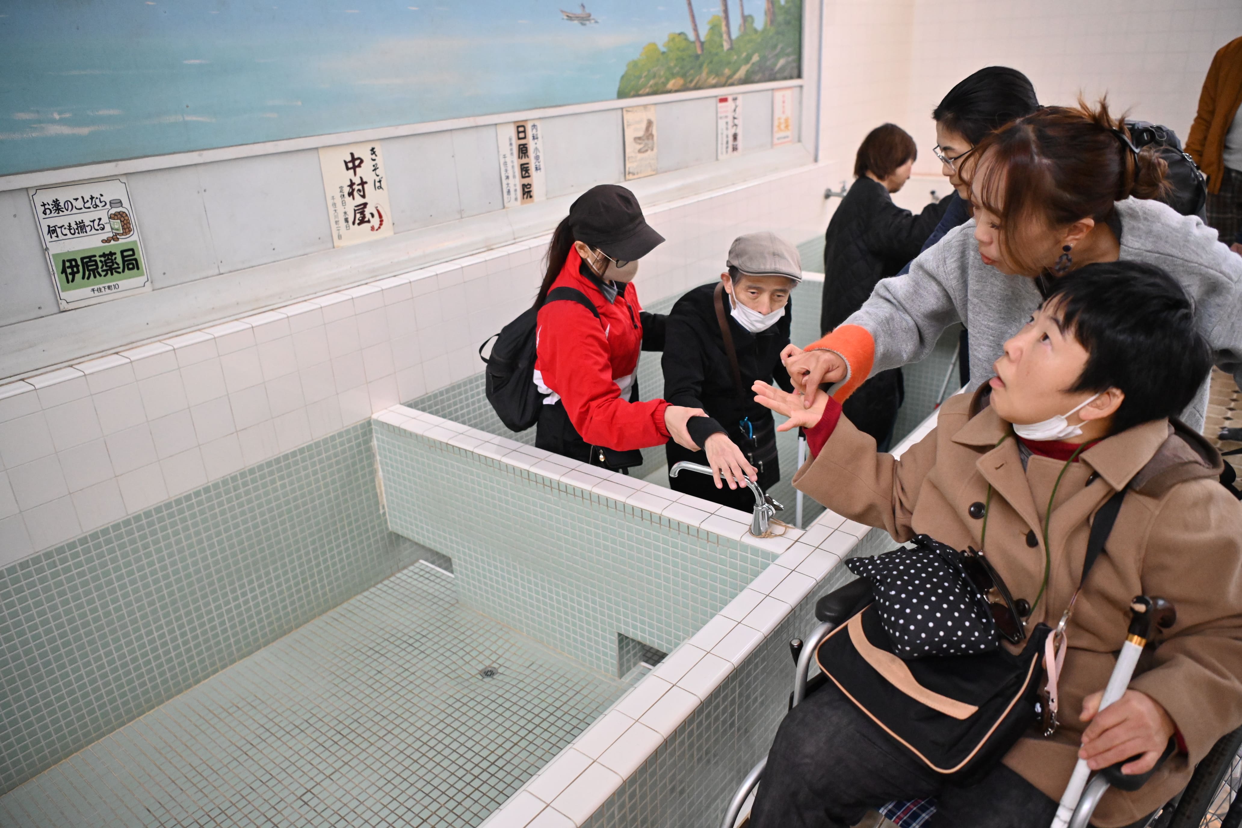 The staff has been preparing for the tour of this Tamoto Garden for several months. Thinking about how to let the deafblind people enjoy the garden and experience the life of Edo and Showa, we started by narrowing down the places to visit from among the 30 buildings and exhibits in the vast site. The first thing we decided to do was to hold the event on the afternoon of November, when autumn deepened, so we would gather around the edge of the hearth where a fire was lit and deepen our learning about the life of the old farmers while feeling the smoke at the Tenmyoke family of a thatched-roof farmhouse. In addition, pumping water from a well and a Toden vehicle were also candidates. In preparation, we had a researcher who was also a deafblind person visit the park, and the staff learned the basics about the deafblind person, and we also provided an opportunity to actually go around the park and verify it. As a result, this time, we prioritized listening to the staff’s explanations and asking questions in their own communication methods, and we decided to have two public baths: “Tenmeiya” with a hearth and “Kohoyu” in the Showa era.
