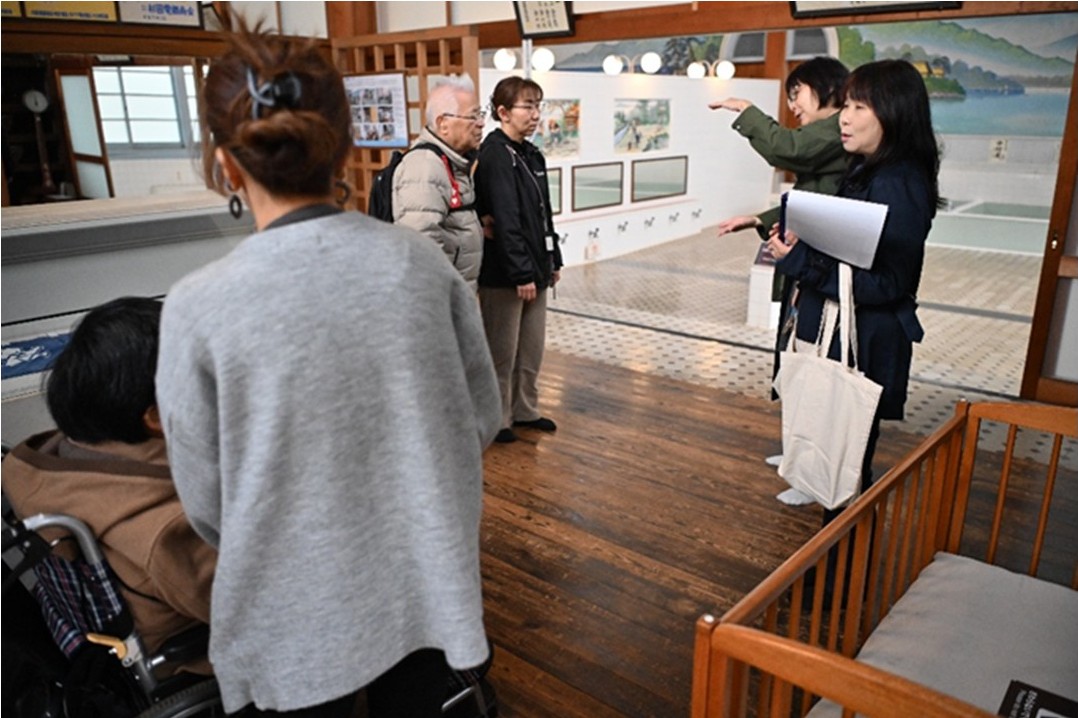 When I was explained, “It was a time when there were many houses without baths, so the bathtub was deep enough to be put in even while standing so that many people could use it,” everyone was curious. Some people were careful to enter the deep bathtub and actually experience its depth, some touched the tiles in the bathroom, and some reminisced about their youthful memories from the exhibits and wall decorations in the dressing room that conveyed what life was like at that time.