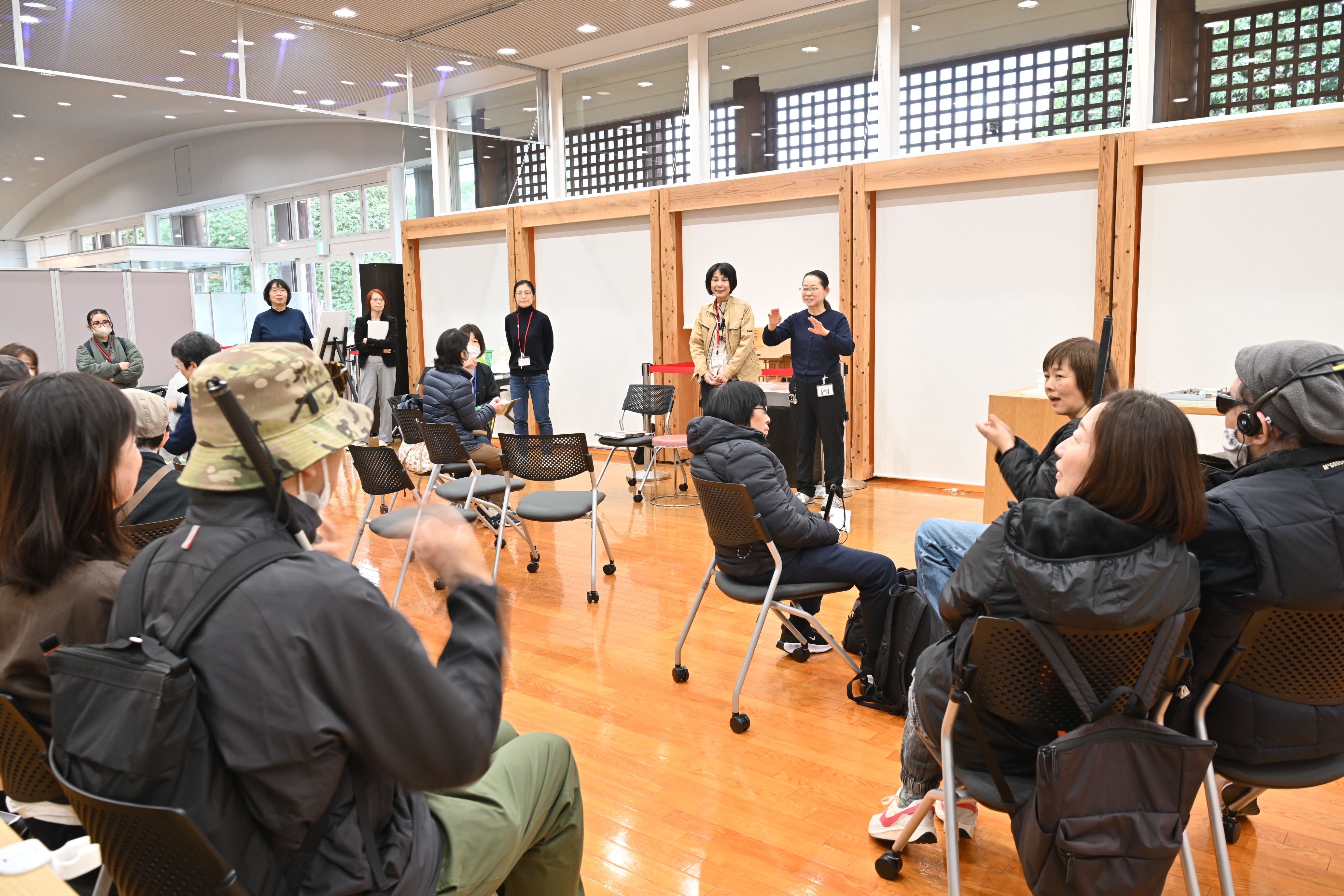 Photo: Participants sitting on chairs in the space at the visitor center and listening to the staff’s explanation