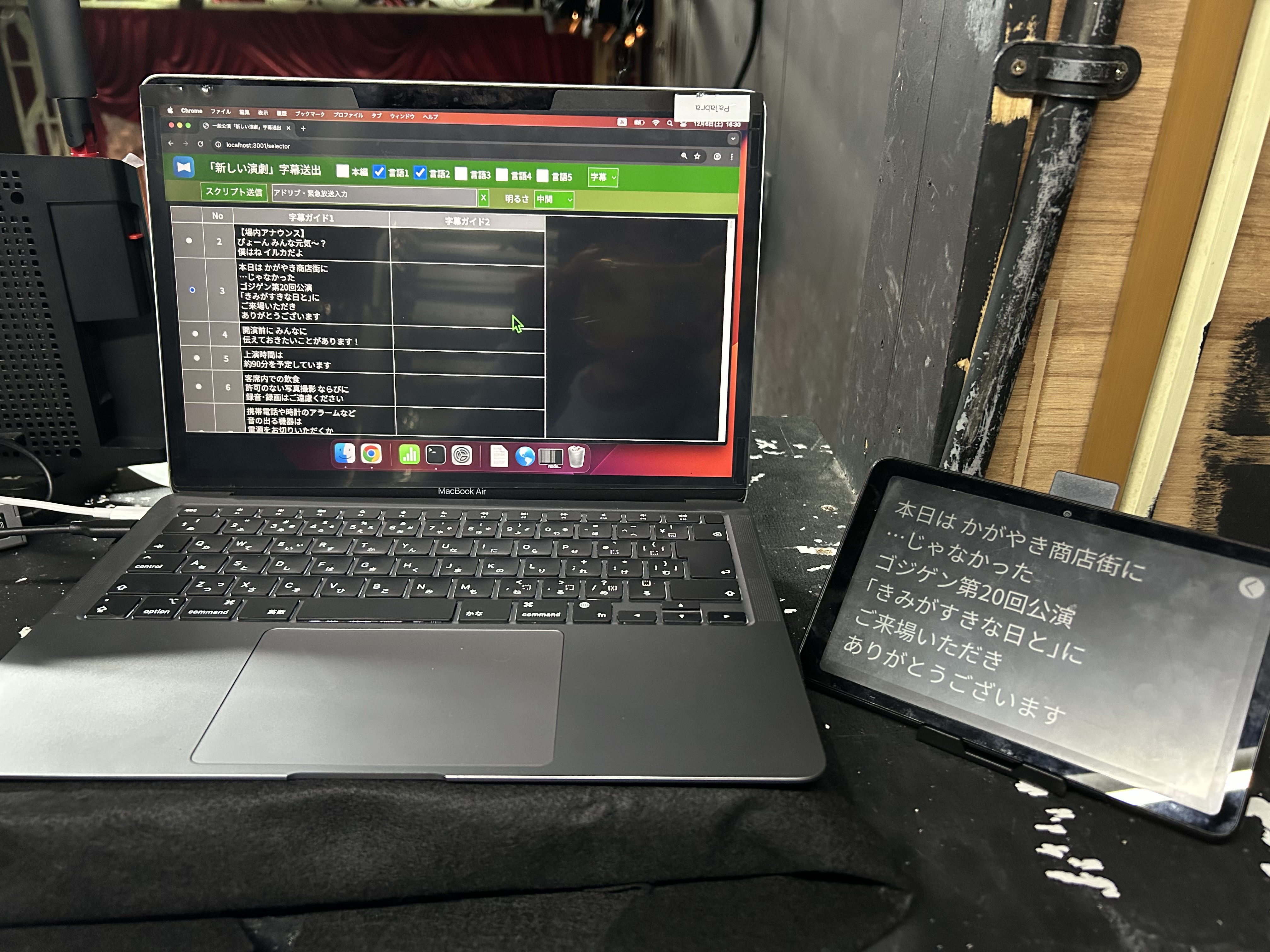 昨年度は台本貸出を実施し、今回は東京芸術文化鑑賞サポート助成を活用してバリアフリー字幕を導入。受付では字幕表示用の機器貸出案内を明示し、手話通訳を配置しての来場者対応を試みた。これらの鑑賞サポートは公演日程の後半に実施され、利用者からは「字幕のおかげで内容がわかるのは嬉しいし、私にとっては遠い遠い、 実に遠かった演劇鑑賞が増えていることに生活に少し彩りしてくれているなと思いました。」「観てよかったなと思える演劇でした。また機会があったら観たいなとも思いました。」といった反応があった。また出演者が終演時に「ありがとう」の手話で挨拶するようになるなど、演じる側の意識も高まったという。