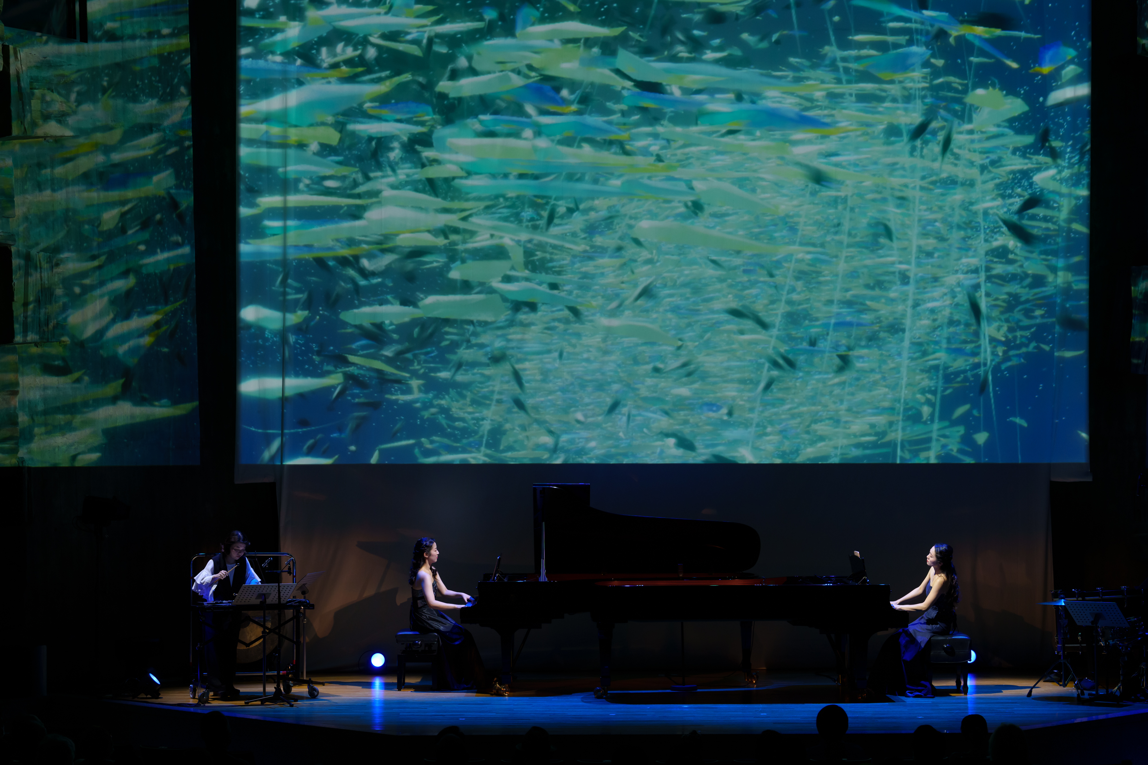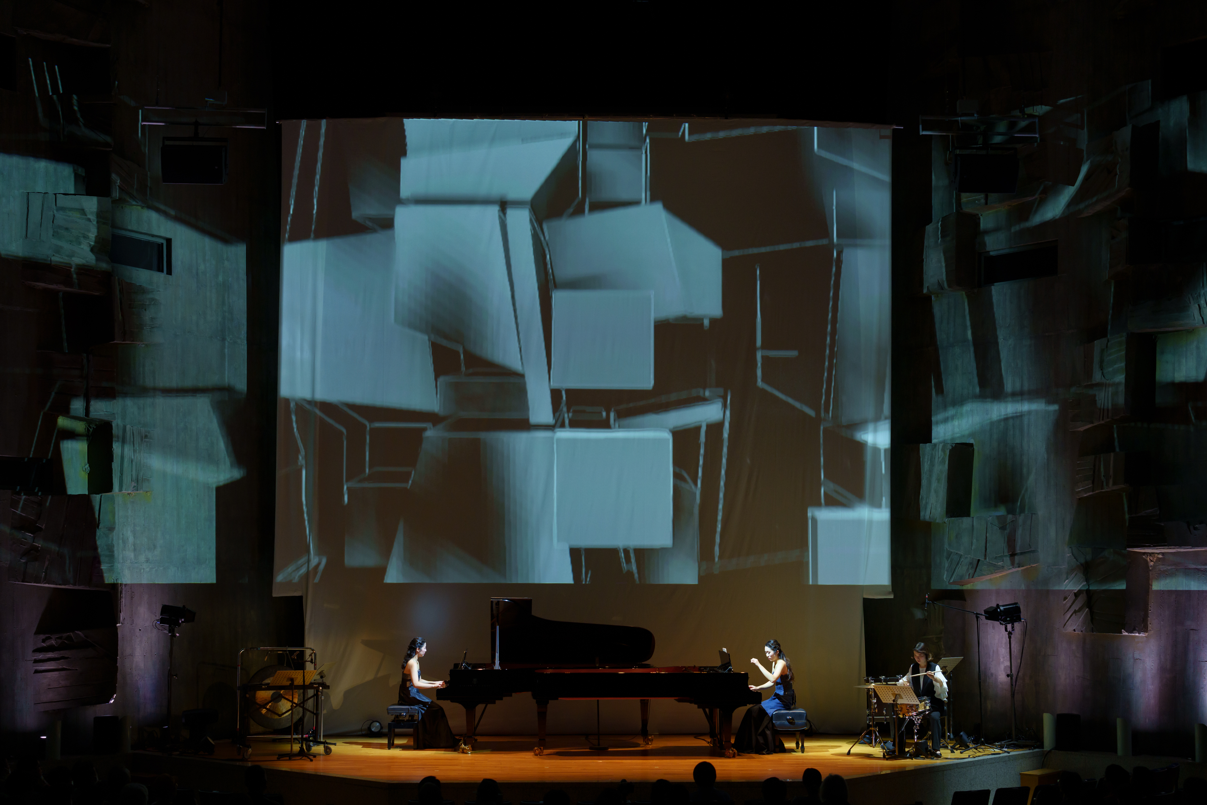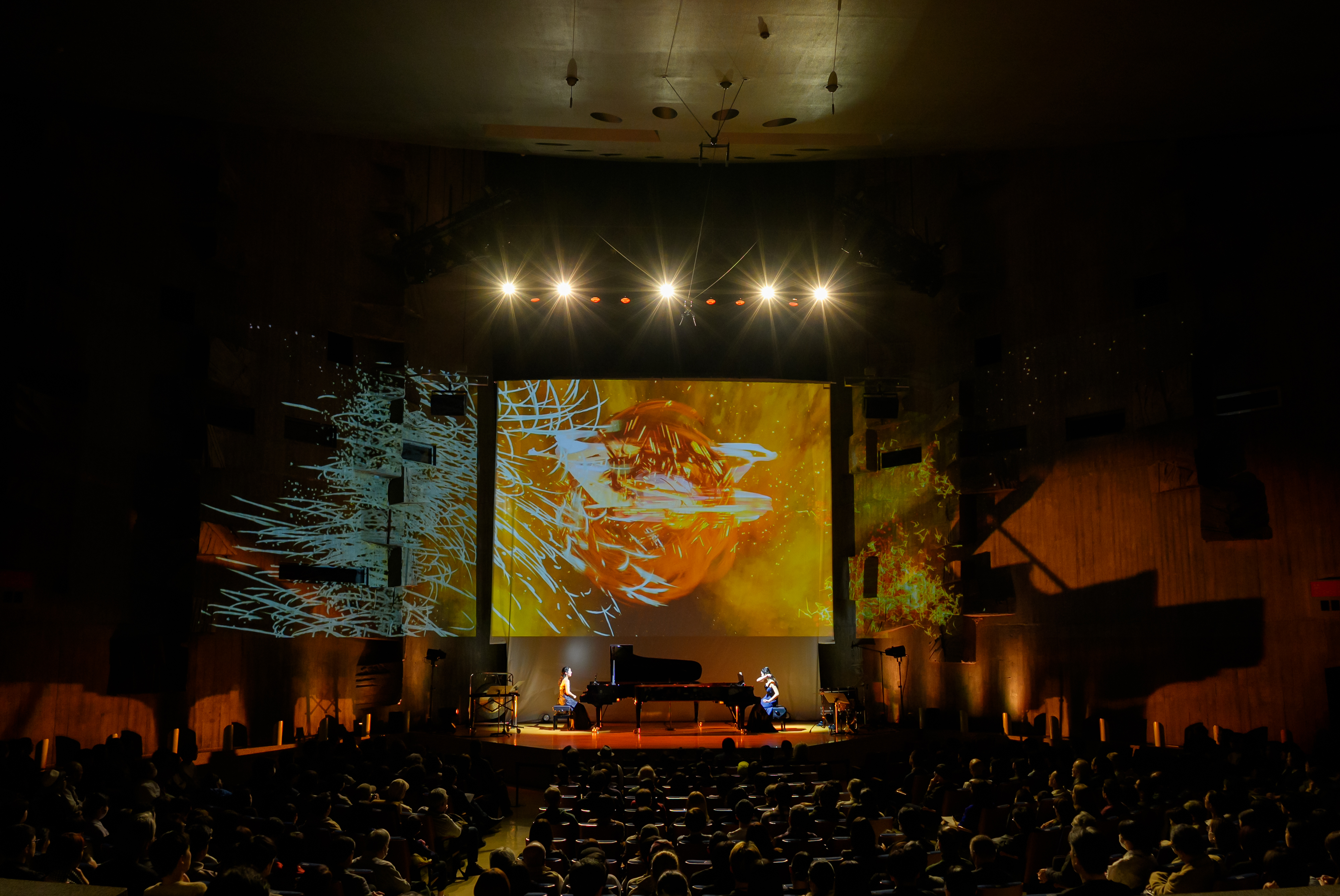 ファリャ『火祭りの踊り』では2台のピアノ演奏と映像の炎の粒子が渦を巻き、ラヴェル『水の戯れ』では波紋が広がり、幾何学の映像が『ボレロ』のリズムにあわせて舞台上に繰り広げられ、小ホールの空間全体が音楽と映像に包まれるコンサートとなりました。